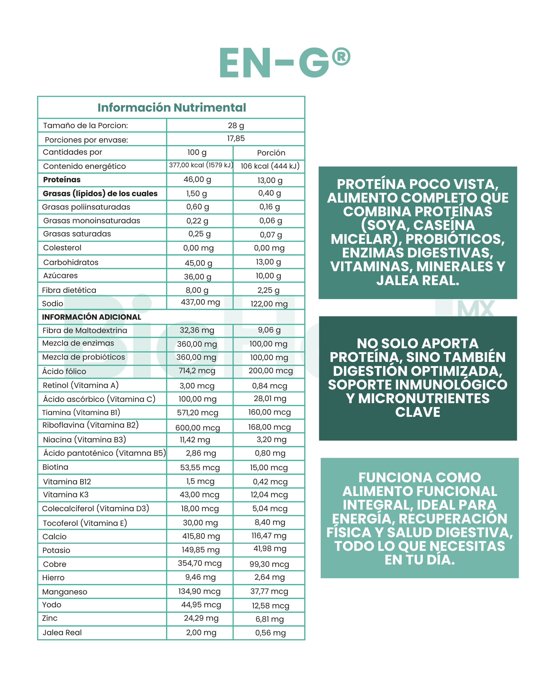 EN-G® no es solo una proteína: es un alimento completo funcional, diseñado para aportar energía, recuperación física, soporte digestivo e inmunológico en una sola toma. Ideal para personas con alta demanda física, mental o nutricional.