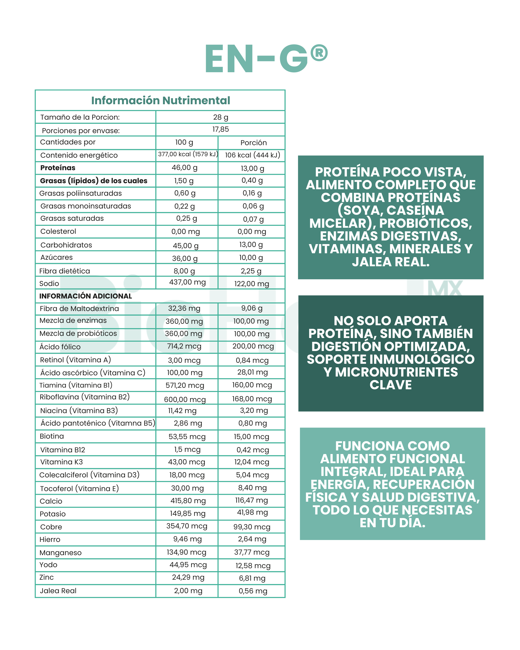 Proteína funcional + Enzimas digestivas + Probióticos + Jalea real + Vitaminas y minerales - EN-G