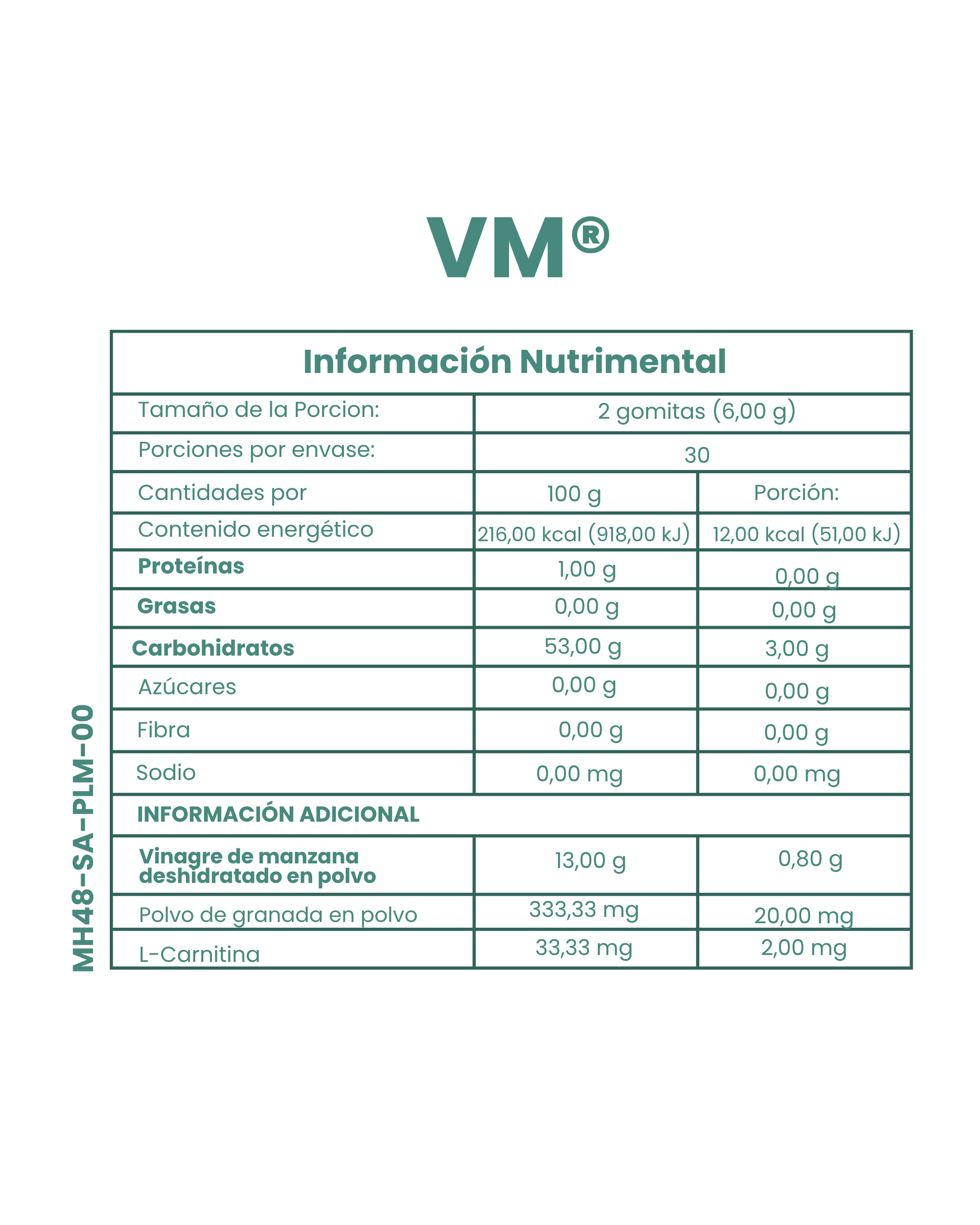 VM® combina el poder metabólico del vinagre de manzana y la L-carnitina con la anti oxidación celular de la granada , creando un efecto integral: