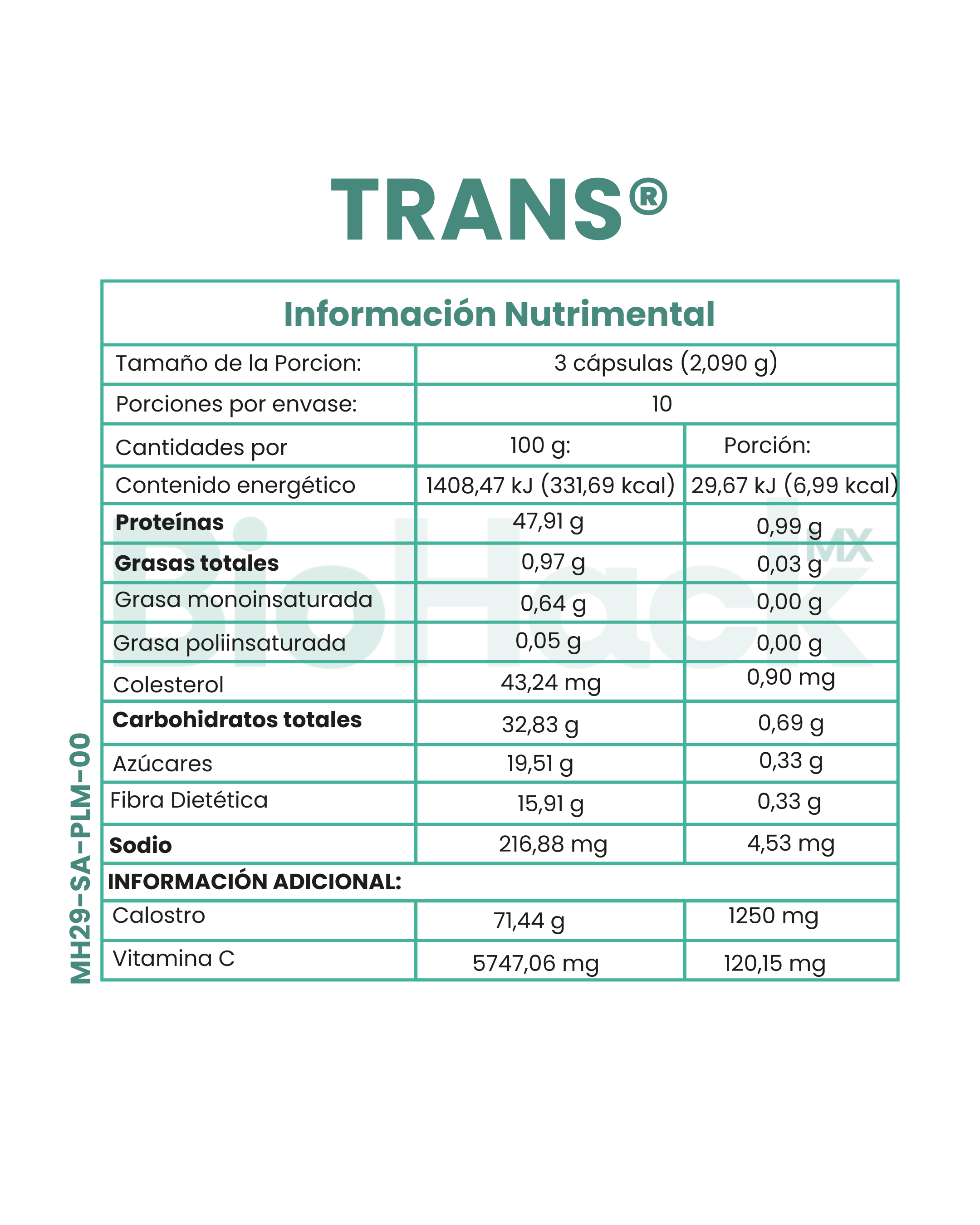 TRANS® es un suplemento alimenticio en cápsulas formulado a base de calostro bovino estandarizado y vitamina C, diseñado para fortalecer el sistema inmune, proteger mucosas y apoyar procesos de recuperación, inflamación e infecciones recurrentes.