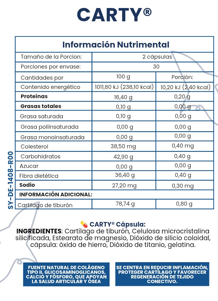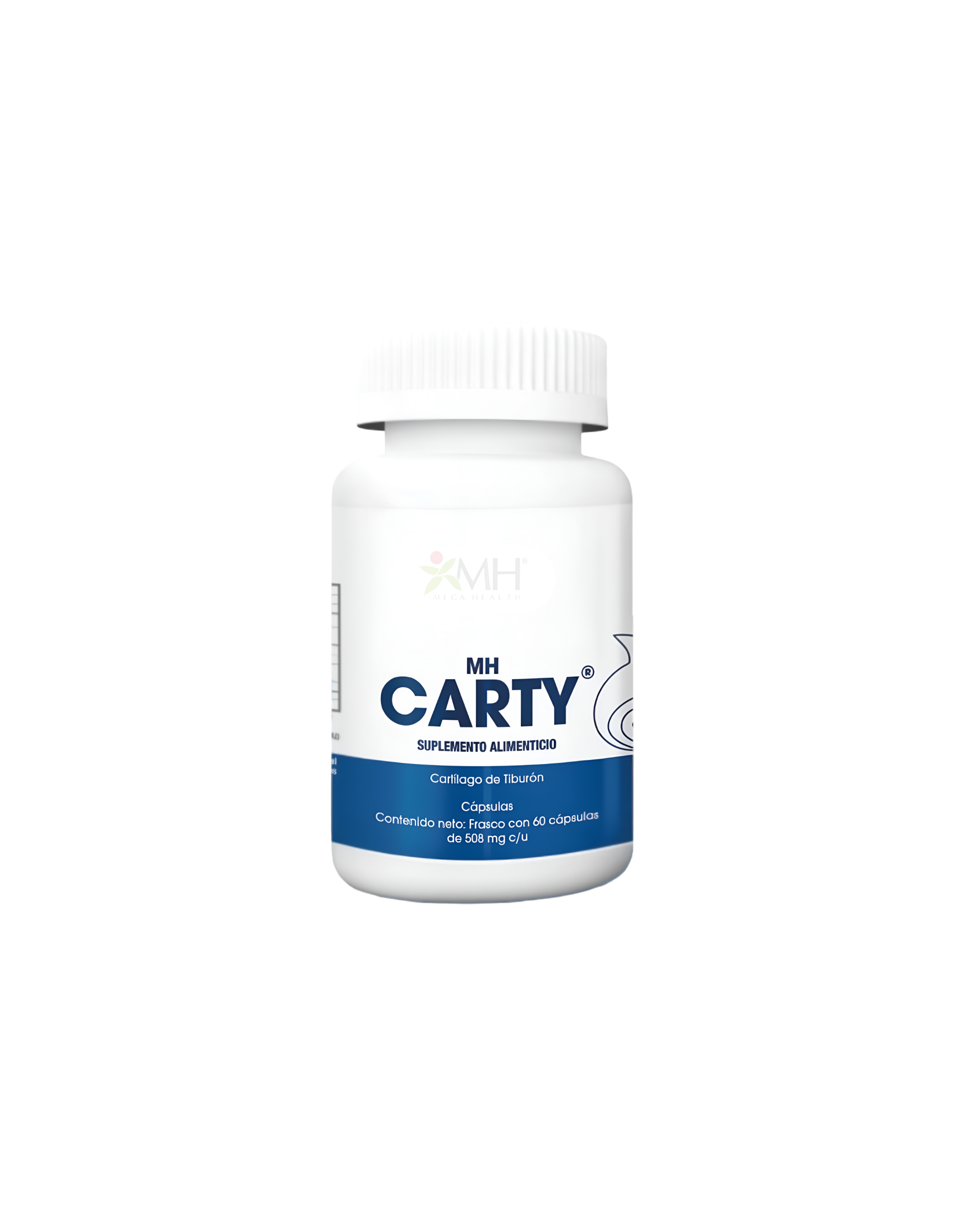 CARTY® es un suplemento a base de cartílago de tiburón, una fuente natural altamente concentrada de colágeno, glicosaminoglicanos, calcio y fósforo, enfocado en la protección del cartílago, la reducción de inflamación y la regeneración del tejido conectivo.