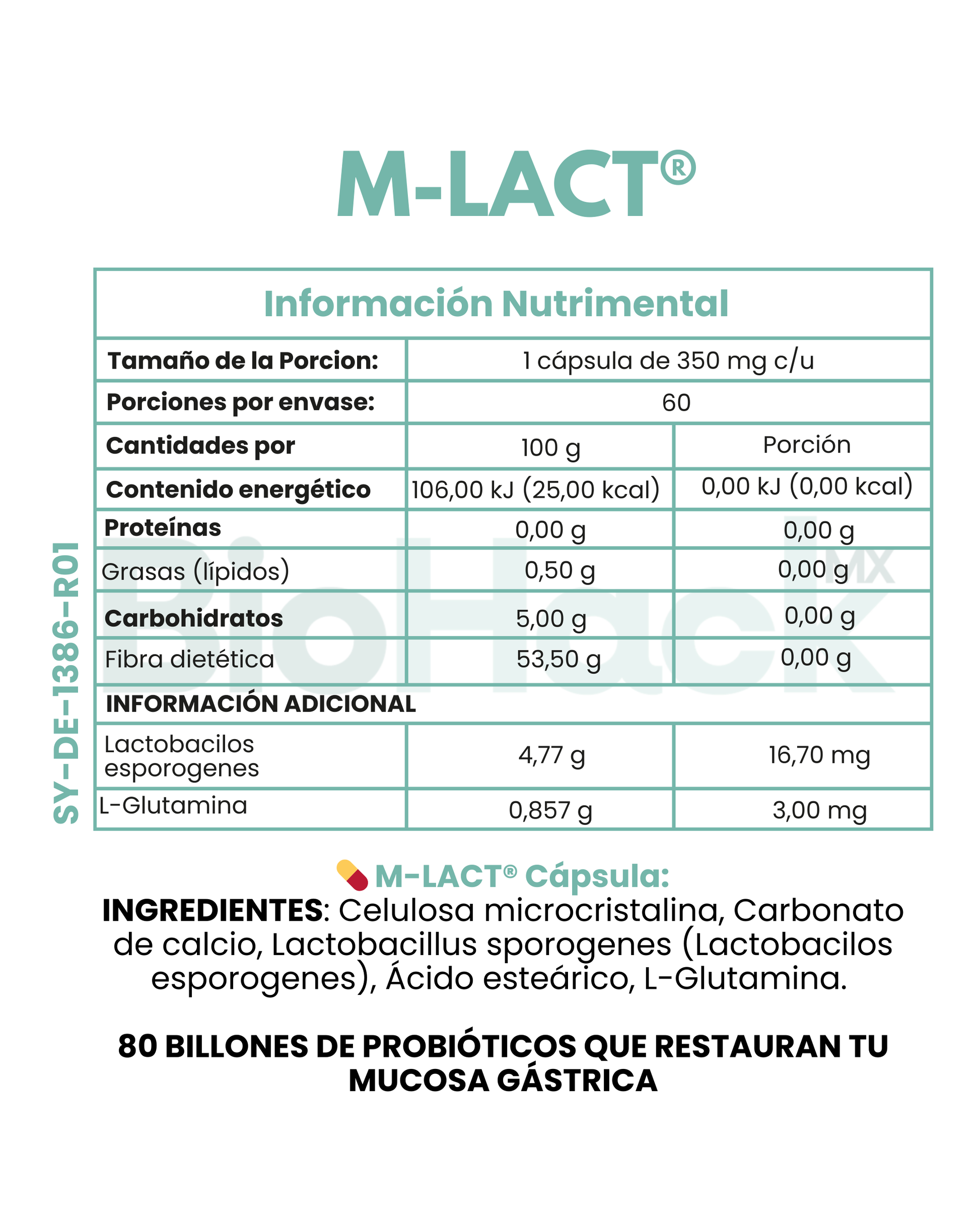 M-LACT® es un suplemento alimenticio diseñado para regenerar la mucosa intestinal, fortalecer la barrera intestinal, mejorar la microbiota y disminuir síntomas como inflamación, gases, diarrea, estreñimiento o colitis.